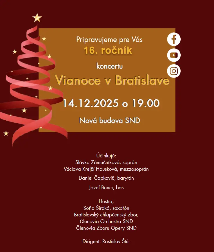 Miesto konania: nová budova SND, Sála opery a baletu Dátum konania (Koncert): 14. 12. 2025 19:00 h – 22:00 h 16. ročník adventného koncertu Vianoce v Bratislave opäť ponúkne operné